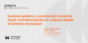Find out more »La Facultad de Economía, Empresa y Turismo, en el marco de CONECTA CAMPUS SUR, organiza este evento que se celebrará en el Auditorio de Adeje el viernes 17 de abril de 2026, en horario de 9:30 a 14:30 horas. El objetivo general de esta actividad es el de analizar y comprender la gestión y promoción turística en el ámbito municipal dentro del marco de las políticas públicas locales y el desarrollo territorial sostenible, acercando al alumnado a la realidad profesional del…