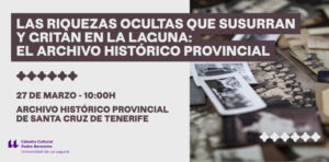 Find out more »El 27 de marzo a las 10:00 horas, la Cátedra Cultural Pedro Bencomo de la Universidad de La Laguna, conjuntamente con el Departamento de Didácticas Específicas de la Facultad de Educación, han organizado una visita didáctica al Archivo Histórico Provincial de Santa Cruz de Tenerife, la cual forma parte de una serie de visitas a archivos y bibliotecas con el objetivo de: promover el conocimiento, la valoración y el disfrute del patrimonio cultural documental y bibliográfico de la ciudad de…