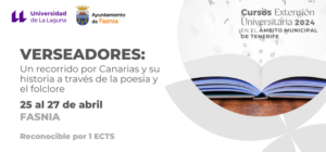 Find out more »Fasnia acoge el curso «Verseadores: Décima y punto cubano como patrimonio de Canarias y América», organizado conjuntamente por el Vicerrectorado de Cultura y Extensión Universitaria y el Ayuntamiento de Fasnia, dentro de la programación de los Cursos de Extensión Universitaria en el ámbito municipal “Ayuntamientos 2025”, que se celebrará los días 24, 25 y 26 de abril de 2025. Objetivos: O1.- Interesar y dotar al alumnado del conocimiento del papel de la poesía popular como narradora de acontecimientos y testigo…