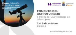 Find out more »Fasnia acoge el curso «Fomento del astroturismo a través del uso y manejo de telescopios», organizado conjuntamente por el Vicerrectorado de Cultura y Extensión Universitaria y el Ayuntamiento de Fasnia, dentro de la programación de los Cursos de Extensión Universitaria en el ámbito municipal “Ayuntamientos 2024”, que se celebrará los días 7, 8 y 9 de octubre de 2024. Objetivos: Dotar al alumnado del conocimiento para iniciarse en el uso y manejo de telescopios y las características a seguir para la planificación…