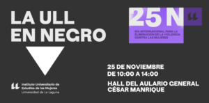 Find out more »El 25 de noviembre de 10:00 a 14:00 horas se instalará un stand en el hall del Aulario General César Manrique donde la comunidad universitaria podrá escribir mensajes contra las violencias machistas y fotografiarse con mensajes de concienciación y sensibilización y movilizarse en sus redes con los hashtag #LaULLenNegro y etiquetando al Instituto Universitario de Estudios de las Mujeres. Se invita a toda la comunidad universitaria y a asistir de negro a la concentración que se realizará a las 14:00…