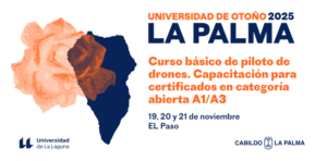 El Paso acoge el curso de Extensión Universitaria « Curso básico de piloto de drones. Capacitación para certificados en categoría abierta A1/A3», que se celebrará los días 19, 20 y 21 de noviembre de 2025 en horario de 16:00 a 20:00 horas en el marco de la “Universidad de Otoño de La Palma 2025”. Objetivos del curso: - Adquisición de conocimientos necesarios para afrontar con garantías los exámenes online conducentes a la obtención de los certificados de vuelo en categoría…