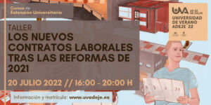 Find out more »Taller de Extensión Universitaria perteneciente a la programación de la convocatoria de Cursos de Extensión Universitaria “Universidad de Verano de Adeje 2022”, que se celebrará en el Centro Cultural de la Villa de Adeje el día 20 de julio de 2022. Objetivos: Exposición y análisis de los nuevos contratos de trabajo en los sectores privado y público: discusión de supuestos y régimen aplicable. Metodología docente: Clase teórico-práctica. Dirigido a alumnos de grado y posgrado de Derecho, Relaciones Laborales, Economía, ADE y Contabilidad y Finanzas;…