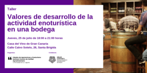 Taller organizado por el Vicerrectorado de Cultura, Participación Social y Campus Ofra y La Palma a través de su Cátedra de Agroturismo y Enoturismo de Canarias. Colabora: Denominación de Origen Protegida de Vinos de Gran Canaria. Objetivos: El taller está dividido en tres partes, la primera, en la que se desarrollará una dinámica colaborativa entre los asistentes con el fin de identificar recursos enoturísticos con que cuenta la isla de Gran Canaria, la segunda parte conocimiento de la experiencia de…