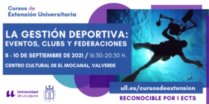 Find out more »Curso de Extensión Universitaria perteneciente a la programación de la convocatoria de Cursos de Extensión Universitaria “Campus Isla El Hierro 2021”, que se celebrará en modalidad presencial los días 8, 9 y 10 de septiembre en el municipio de Villa de Valverde. Objetivos: Adquirir los conocimientos necesarios para organizar un evento deportivo. Conocer las herramientas imprescindibles para el día a día de un club o de una federación deportiva. Gestionar subvenciones de diversa índole que puedan beneficiar a clubes y federaciones deportivas.…