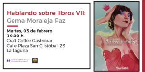 Find out more »Séptima edición de la tertulia bibliográfica organizada junto al Craft Coffee Gastrobar y la asociación cultural de relaciones internacionales «Hacer para el Desarrollo». En esta ocasión, tendremos la presencia de la escritora Gema Moraleja Paz, que hablará de su obra «La dama de corazones». Para más información, pulse este enlace