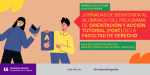 Find out more »La Facultad de Derecho de la Universidad de La Laguna ha organizado unas Jornadas de bienvenida al alumnado del Programa de Orientación y Acción Tutorial (POAT) para el viernes 21 de octubre a las 11:30 horas. En estas jornadas se explicará al alumnado de primer curso, tanto del Grado en Derecho como del Grado en Relaciones Laborales, las ventajas y oportunidades que ofrece este programa. Además, en este primer encuentro, especialistas explicarán las titulaciones y abordarán cuestiones básicas para que…