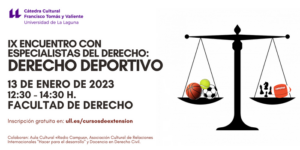 Find out more »Actividad de Extensión Universitaria organizada por la Cátedra Cultural «Francisco Tomás y Valiente», el Aula Cultural Radio Campus», la Asociación cultural de relaciones internacionales «Hacer para el Desarrollo» y Docencia en Derecho Civil, que se celebrará en la Facultad de Derecho el día 13 de enero de 2023 en horario de 12:30 a 14:30 horas. El encuentro, consistirá en una charla abierta al público interesado, por lo que se pretende ilustrar a la audiencia sobre el Derecho Deportivo, como especialidad…