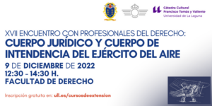 Find out more »Actividad de Extensión Universitaria organizada por la Cátedra Cultural "Francisco Tomás y Valiente" en colaboración con el Mando Aéreo de Canarias (MACAN) del Ejército del Aire de las Fuerzas Armadas de España, que se celebrará en la Facultad de Derecho el día 9 de diciembre de 2022 de 12:30 a 14:30 horas. El evento pretende acercar a la comunidad universitaria el conocimiento de las salidas profesionales que ofrece el Ejército del Aire para quienes ostentan la titulación en Derecho. El…