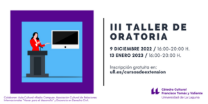 Find out more »Actividad de Extensión Universitaria organizada por la Cátedra Cultural «Francisco Tomás y Valiente», con la colaboración del Aula Cultural «Radio Campus», Docencia en Derecho Civil y la Asociación cultural de relaciones internacionales «Hacer para el desarrollo», que se celebrará en la Facultad de Derecho los días 9 de diciembre de 2022 y 13 de enero de 2023 de 16:00 a 20:00 horas. El taller pretende iniciar a la audiencia en los fundamentos de la comunicación verbal y textual, de cara…