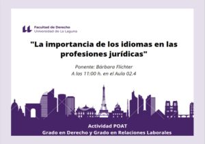 Find out more »El viernes 18 de noviembre, en el aula 02.4 de la Facultad de Derecho a las 11:00 h. , se celebra la cuarta actividad en el marco del POAT. En esta actividad, tenemos como ponente invitada a Barbara Flichter, traductora para las instituciones de la Unión Europea. En su ponencia nos hablará sobre la importancia de los idiomas en las profesiones jurídicas. Esta actividad está dirigida al alumnado de primero, tanto del Grado en Derecho como del Grado en Relaciones…