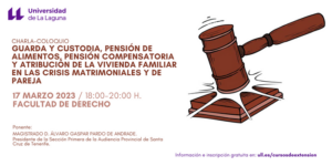 Find out more »Esta actividad de Extensión Universitaria forma parte de la actividad formativa de la asignatura Derecho Civil de La Familia del Grado en Derecho, que se celebrará en la Facultad de Derecho el 17 de marzo de 2023, en horario de 18:00 a 20:00 horas. En la charla-coloquio se debatirá sobre las principales cuestiones jurídico-prácticas de las crisis matrimoniales y de pareja. Imparte: Álvaro Gaspar Pardo de Andrade. Presidente de la Sección Primera de la Audiencia Provincial de Santa Cruz de…