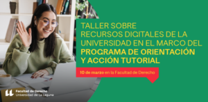 Find out more »El viernes 10 de marzo tendrá lugar un taller sobre recursos digitales de la Universidad en el marco del Programa de Orientación y Acción Tutorial (POAT). El taller está dirigido al alumnado del Grado en Derecho y del Grado en Relaciones Laborales. El objetivo del encuentro es que los alumnos y alumnas aprendan a utilizar el portal de búsqueda de la Universidad de La Laguna y tener acceso a materiales necesarios para la superación de las asignaturas de la carrera.…