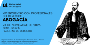 Find out more »La Cátedra Cultural «Francisco Tomás y Valiente» y el Área de Derecho Civil del Departamento de Disciplinas Jurídicas Básicas organizan este encuentro que se celebrará en la Facultad de Derecho el 24 de noviembre de 2023 de 17:00 a 20:00 horas. El objetivo del presente seminario es el de tratar tres temas de actualidad en el ámbito del oficio jurídico del notariado y en el ámbito del Derecho de Sucesiones. Imparte: Nicolás Quintana Plasencia. Notario del Ilustre Colegio Notarial de…