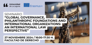 Find out more »La Cátedra Cultural «Francisco Tomás y Valiente» y el Programa Erasmus+ organizan este seminario que se impartirá en la Facultad de Derecho el 27 de noviembre de 2024, en horario de 16:00 a 17:30 horas. El objetivo del seminario es el de exponer las conclusiones de un proyecto de investigación auspiciado por el gobierno suizo en materia de gobernanza global, organizaciones filantrópicas y organismos internacionales, desde la óptica del Derecho Internacional. El seminario será una exposición en la forma de…