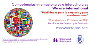 Este curso de formación en competencias internacionales e interculturales forma parte de la estrategia de Internacionalización en casa (Internationalization at home) promovida por el Vicerrectorado de Proyección, Internacional y Cooperación, con la colaboración del Vicerrectorado de Cultura y Participación Social, y financiado por el Cabildo Insular de Tenerife, que se celebrará en modalidad presencial en las Facultades de Derecho y de Economía entre el 29 de noviembre y el 16 de diciembre de 2021, reconocible por 1 crédito ECTS. Vivimos en un mundo…