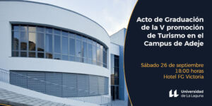 El sábado 26 de septiembre tendrá lugar el Acto de Graduación de la V Promoción de Turismo en el Campus de Adeje. Este evento comenzará a las 18:00 horas y se celebrará en el Hotel GF Victoria en el municipio de Adeje en el sur de Tenerife. Programa del evento