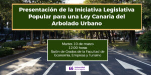 Find out more »Presentación de la la Iniciativa Legislativa Popular para una Ley Canaria de Protección del Arbolado Urbano. El acto será presentado por Rosa Aguilar, rectora de la Universidad de La Laguna e intervendrán Francisco Amador, profesor de la Facultad de Economía, Empresa y Turismo de la ULL, Cristina Amigó, representante del colectivo de arquitectas Cascos Púrpura y Domingo Afonso, portavoz de Parents for Future Canarias, la asociación promotora de la iniciativa. El periodista Mariano de Santa Ana ejercerá de moderador. La…
