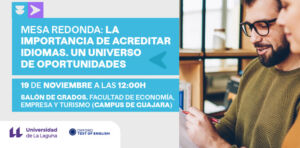 Find out more »El Vicerrectorado de Internacionalización y Cooperación de la Universidad de La Laguna organiza, con la colaboración del Servicio de Idiomas y la Fundación Cajacanarias, organiza el martes 18 de marzo, a las 16:00 h en el Salón de Grados de la Facultad de Economía, Empresa y Turismo, una mesa redonda titulada “Abriendo puertas hacia oportunidades en EEUU”, dentro del conjunto de mesas lingüísticas "La importancia de acreditar los idiomas" que ha desarrollado hasta ahora por su 30º aniversario. Moderadora: Judit…