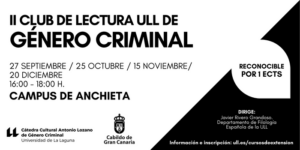 Actividad de Extensión Universitaria organizada por la Cátedra Cultural Antonio Lozano de Género Criminal en colaboración con el Cabildo Insular de Gran Canaria, que tendrá lugar los días 25 de marzo, 29 de abril, 27 de mayo y 24 de junio de 2022 en horario de 17:30 a 19:30 horas en la Torre Profesor Agustín Arévalo en el Campus Central. La actividad tiene como objetivos socializar la lectura a partir de un género fácilmente reconocible, fomentar la lectura y la…