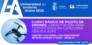 Find out more »El municipio de Arona acoge este curso que forma parte de la oferta de Cursos de Extensión Universitaria «Universidad de Invierno de Arona 2026», que se celebrará los días 10, 11 y 12 de marzo de 2026 en horario de 16:00 – 20:00 horas en el Centro Cultural Los Cristianos. Objetivos: Adquisición de conocimientos necesarios para afrontar con garantías los exámenes online conducentes a la obtención de los certificados de vuelo en categoría abierta A1/A3. Adquisición de experiencia básica en…