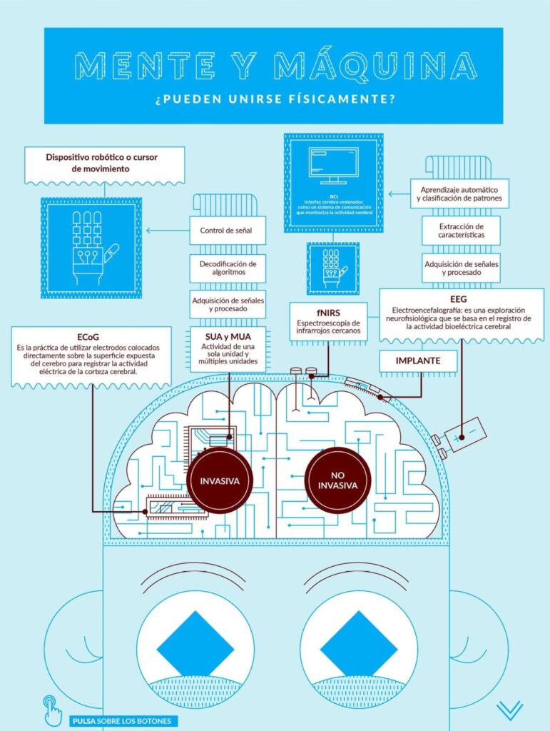 Los enfoques invasivos como el BCI incluyen la medición de potenciales de campo locales, la actividad de una sola unidad, la actividad de múltiples unidades y la electrocorticografía. Los enfoques no invasivos de BCI más empleados son la electroencefalografía, la resonancia magnética funcional y la espectroscopía de infrarrojo cercano. Estos dos últimos no miden la actividad neuronal directamente, sino que miden un fenómeno asociado a la actividad neuronal durante el acoplamiento neurovascular, como veremos enseguida. De las señales cerebrales que se obtienen, se extraen las características relevantes para el objetivo del BCI (por ejemplo, la comunicación) y se clasifican usando un algoritmo de traducción, que permite construir una señal que controla el dispositivo electrónico externo, ya sea un brazo robótico, una silla de ruedas o el cursor de un ordenador. A la vista de esto, los BCI pueden ser de asistencia, para ayudar a los pacientes con comunicación o movimiento, o de rehabilitación para ayudar a recuperar la función neuronal.