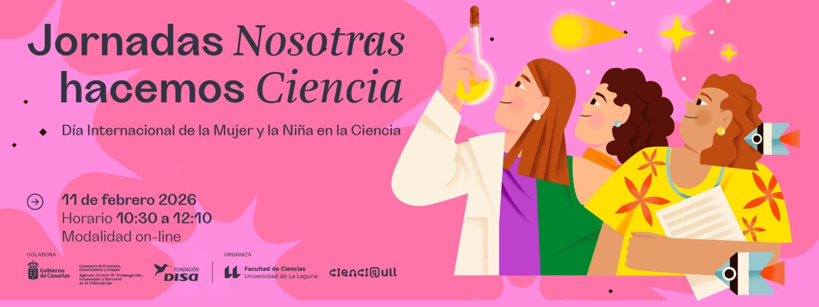 Con la finalidad de contribuir a la conmemoración del día internacional de la «Mujer y la Niña en la Ciencia (11 de febrero de 2026)» se celebra una nueva edición de la jornada «Nosotras Hacemos Ciencia», que tiene como finalidad «mostrar la importancia de la figura de la mujer en la ciencia, la innovación y la tecnología, así como para fomentar las vocaciones científicas y tecnológicas de las jóvenes canarias». Esta iniciativa es promovida por la Facultad de Ciencia de la ULL y la Unidad de Cultura Científica y de la Innovación (Cienci@ULL) con la colaboración de la Agencia Canaria de Investigación, Innovación y Sociedad de la Información del Gobierno de Canarias y la Fundación Disa.