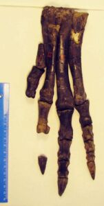 El caso del Othnielosaurus fue más “fácil” de resolver. Este dinosaurio tenía en el primer dedo (el dedo gordo del pie en nuestro caso), que debería ser recto, una ligera forma de U. Además, las superficies de articulación entre los huesos que forman el segundo y cuarto dedo tenían una extraña zona hundida, y el tercer dedo mostraba una extraña placa de hueso. Ante esto se plantearon varias explicaciones. El dedo “gordo” mostraba las características típicas de una fractura curada, es decir, con la típica desviación del hueso en forma de curvatura, entorno a la cual se observaba un área engrosada similar a los callos óseos que se forman cuando se rompe un hueso (una superficie con suaves hoyuelos). Las zonas hundidas eran menos evidentes como muestras de fracturas, pero de hecho también lo eran; se debían al golpe entre las diferentes falanges que formaban el hueso. Por último, la placa de hueso, tras un detallado estudio resultó ser la manifestación de una enfermedad que hace que se produzcan depósitos de calcio sobre la superficie de los huesos.