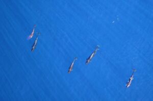 Figura 2. Grupo familiar de calderón tropical con crías grabado con dron en el SW de Tenerife por el equipo de investigación BIOECOMAC, de la ULL.