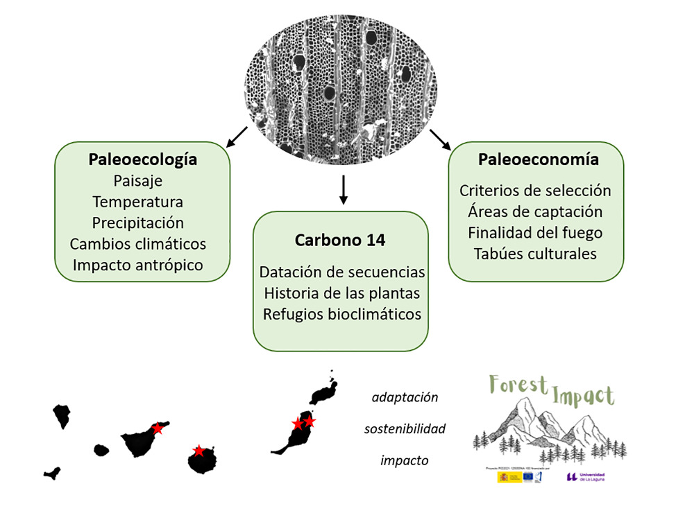 Figura 2. Esquema de la información que se obtiene con la antracología y localización de los yacimientos arqueológicos de Canarias donde se está aplicando esta disciplina en el marco del proyecto Forest Impact (Tenerife: Cueva de Los Cabezazos, Gran Canaria: la Cueva Pintada y Fuerteventura: Cueva de Villaverde y El Junquillo).
