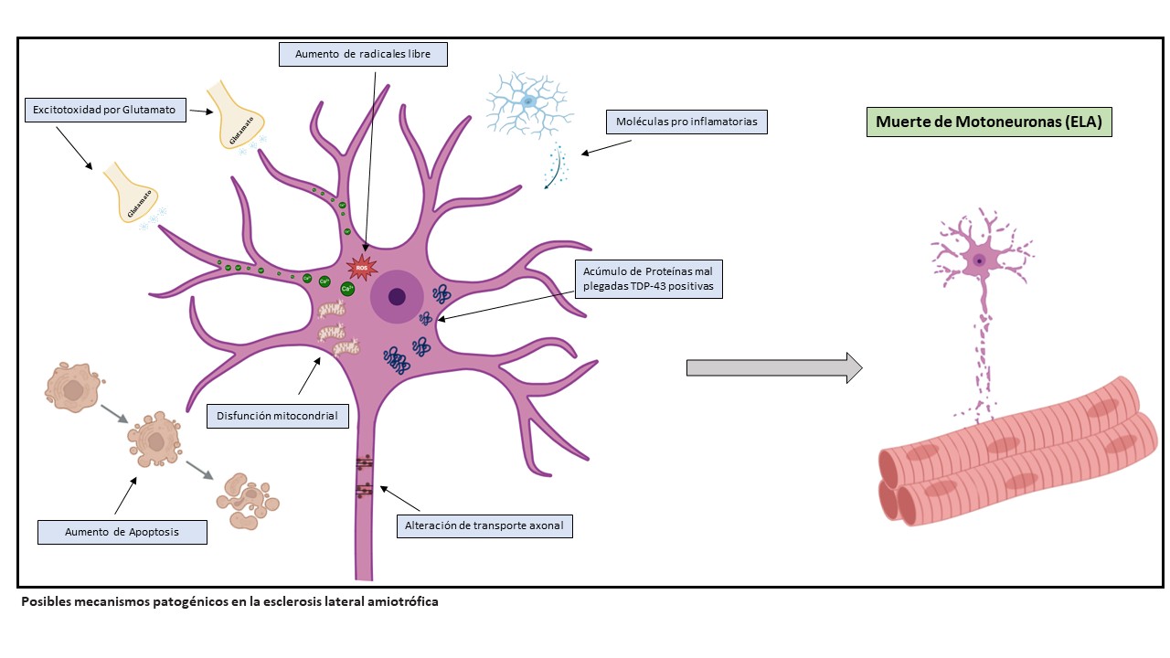 La ELA es una enfermedad heterogénea y no puede considerarse una única entidad. En ella, diversos procesos celulares fallan, como el daño mitocondrial, la acumulación de proteínas y una inflamación descontrolada, lo que lleva a la muerte de las motoneuronas. En términos generales, los principales procesos alterados en la enfermedad incluyen el exceso de glutamato, que provoca excitotoxicidad, así como el estrés oxidativo y la disfunción mitocondrial, que dañan las células y reducen su energía. Además, las alteraciones en el citoesqueleto afectan el transporte de sustancias esenciales, mientras que la inflamación descontrolada agrava el daño neuronal. La apoptosis se activa en exceso, acelerando la degeneración, y la acumulación anómala de proteínas como TDP-43 interfiere con la funcionalidad normal de la célula.