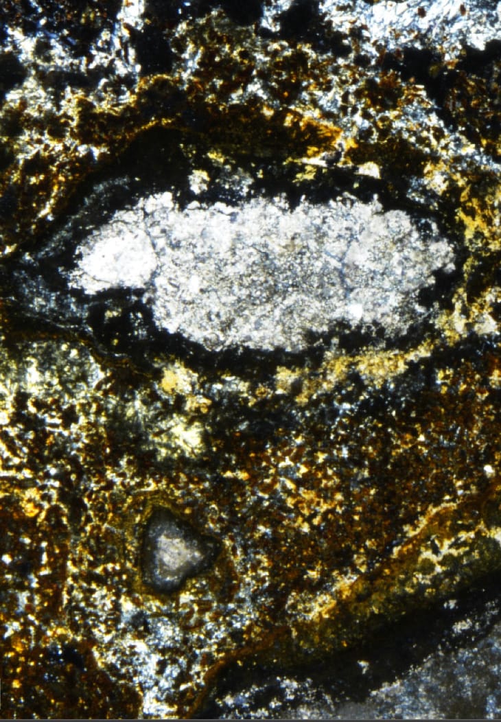 Microfotografía de sección transversal mostrando completa biomineralización secundaria de un fragmento de raíz vegetal (en luz polarizada)
