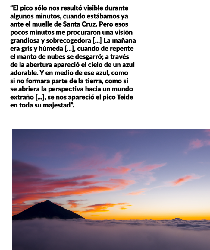 ““El pico sólo nos resultó visible durante algunos minutos, cuando estábamos ya ante el muelle de Santa Cruz. Pero esos pocos minutos me procuraron una visión grandiosa y sobrecogedora […] La mañana era gris y húmeda […], cuando de repente el manto de nubes se desgarró; a través de la abertura apareció el cielo de un azul adorable. Y en medio de ese azul, como si no formara parte de la tierra, como si se abriera la perspectiva hacia un mundo extraño […], se nos apareció el pico Teide en toda su majestad”.