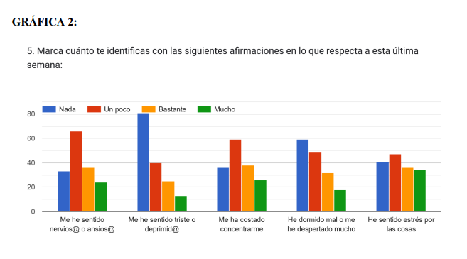 En cuanto a la identificación con una serie de afirmaciones relacionadas con su estado emocional. La menos reconocida fue «sentirse triste o deprimido», mientras que la afirmación con la que más personas se identificaron fue «sentirse estresado/a».
