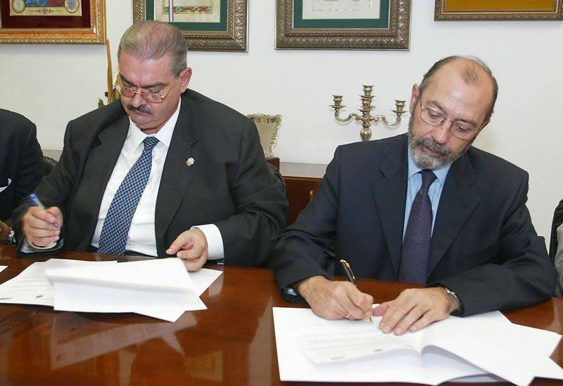 El rector de la Universidad de La Laguna, ángel M. Gutiérrez, y el presidente del Colegio Oficial de Agentes de la Propiedad Inmobiliaria de Santa Cruz de Tenerife, Lorenzo Perera, firmaron hoy viernes 30 de julio un convenio marco por el que las dos instituciones se comprometen a colaborar en el ámbito de la docencia de posgrado a través del Instituto Universitario de la Empresa.