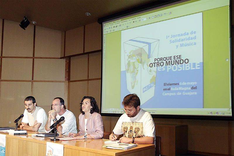Antes de la conferencia, la vicedecana de la Facultad de Filosofía, Inmaculada Perdomo, y el alumno del mismo centro Eloy Cuadra, presentaron un proyecto que están promoviendo para que la Universidad de La Laguna cree un fondo solidario nutrido por aportaciones del 0’7 de los ingresos que percibe la institución en concepto de matrícula de alumnos y sueldos de las personas vinculadas a ella.