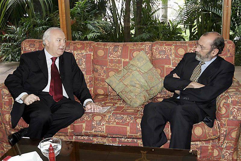 El rector de la Universidad de La Laguna, ángel M. Gutiérrez, y el ministro de Asuntos Exteriores, Miguel ángel Moratinos, se reunieron hoy jueves 12 de mayo en el Puerto de la Cruz para ultimar los preparativos de la próxima implantación en este centro docente del Máster en Diplomacia y Relaciones Internacionales, auspiciado por la Escuela Diplomática.