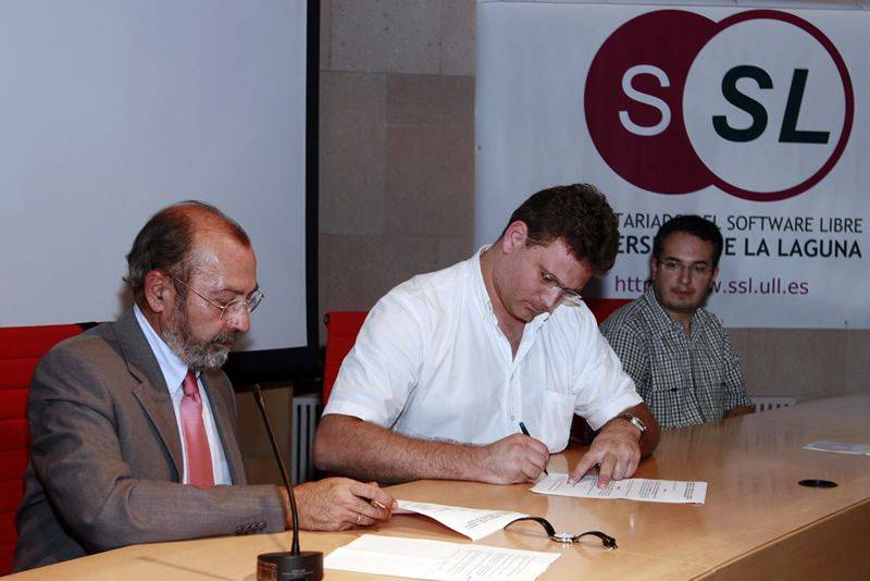 El rector de la Universidad de La Laguna, ángel M. Gutiérrez, y un representante de la Asociación de Usuarios de Linux de Canarias (GULIC), Félix J. Marcelo Wirnitzer, firmaron hoy viernes 22 de septiembre un convenio de colaboración en virtud del cual esta entidad dará soporte técnico a los usuarios de la distribución GNU/Linux Bardinux, creada por el centro académico y presentada en la inauguración de las jornadas sobre el software libre, que han tenido lugar durante toda la semana en la Facultad de Física y Matemáticas.