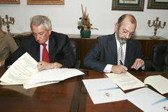 La Universidad de La Laguna y el Grupo Hospitén han firmado hoy, miércoles 21 de febrero de 2006, dos convenios de colaboración mediante los cuales ambas instituciones desarrollarán programas de prácticas destinados a los estudiantes de la institución académica, y pondrán en marcha de un conjunto de trabajos de investigación en el ámbito de la medicina regenerativa. Por la ULL firmó los acuerdos el rector ángel Gutiérrez, mientras que por la empresa sanitaria hizo lo propio su presidente, Pedro Luis Cobiella.