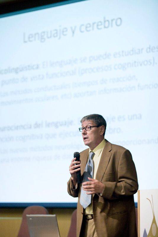El catedrático comenzó explicando que la psicolingística atribuye a la lectura varios niveles de procesamiento: léxico, morfosintáctico, de oraciones y de discurso, lo que hace de la comprensión del lenguaje un fenómeno realmente complejo. En los últimos años se han ido sucediendo diversas técnicas de investigación en este campo que estudian la relación entre el lenguaje y el cerebro. El estudio de pacientes, de gran tradición, es una de ellas, después de la cual ha aparecido la electroencefalografía (EEG) y, más últimamente, las técnicas de neuroimagen, que permiten obtener una visión dinámica de la actividad cerebral.