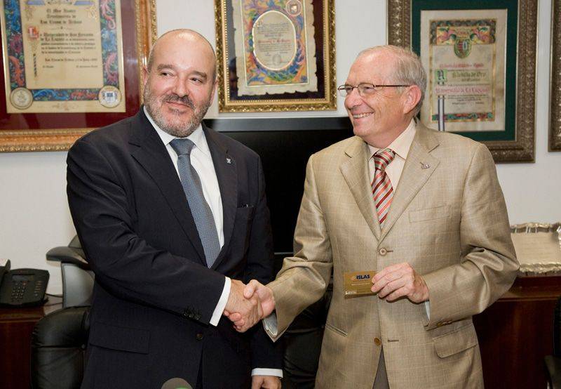 El acto de rúbrica tuvo lugar en la sala de juntas del Rectorado, donde Miguel Concepción entregó a Eduardo Doménech la tarjeta de socio de honor de la firma aérea.