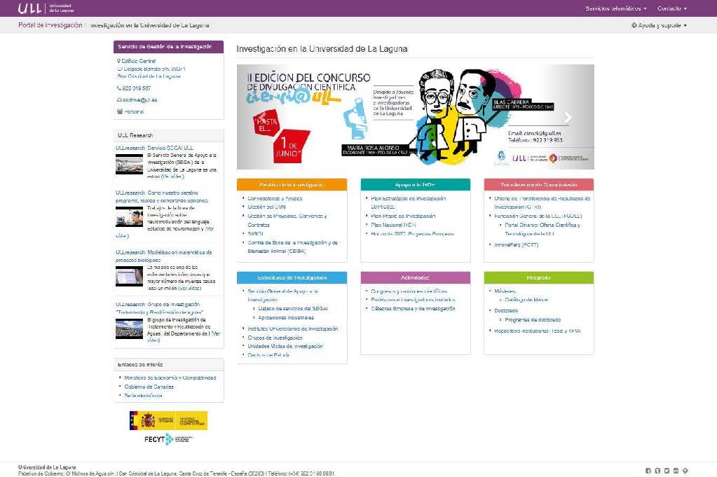 El Vicerrectorado de Investigación, Desarrollo Tecnológico e Innovación de la Universidad de La Laguna ha creado, a través de su Servicio de Apoyo Informático a la Investigación (SAII), un portal de Internet en el que se centraliza toda la información acerca de la labor desarrollada por los científicos de la institución. Esta nueva herramienta telemática lleva aproximadamente un mes de funcionamiento, y en ella ya se han inscrito cerca de un millar de investigadores de la ULL, de un total de 1.800.