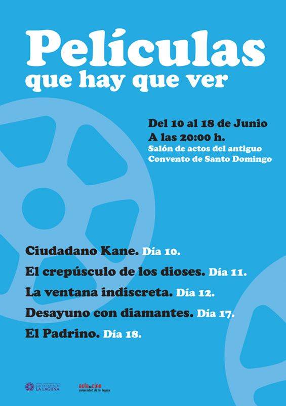 El Aula de Cine de la Universidad de La Laguna, dependiente del Vicerrectorado de Relaciones Universidad y Sociedad, ha organizado en colaboración con el Ayuntamiento de La Laguna el ciclo “Películas que hay que ver”, que se celebrará entre el hoy, jueves 10, y hasta el viernes 18 de junio, a las 20 horas en el salón de actos del antiguo convento de Santo Domingo. Esta muestra, de entrada libre y gratuita, consta de cinco películas imprescindible de la cinematografía estadounidense.