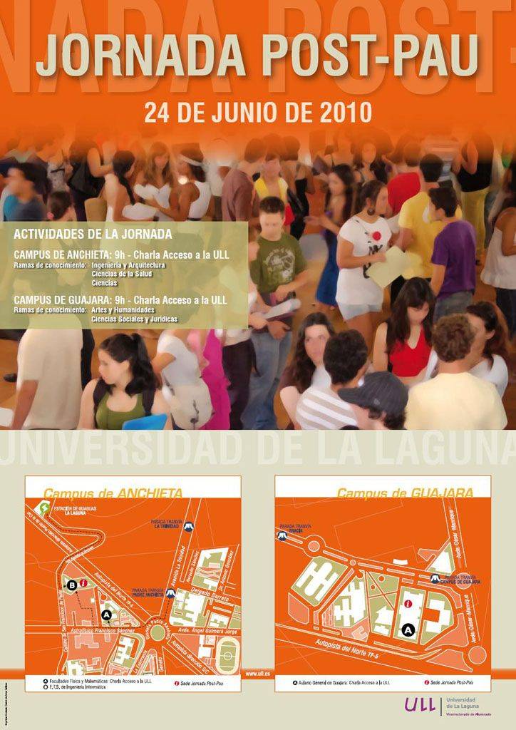 La Universidad de La Laguna celebrará mañana, jueves 24 de junio a partir de las 9 y hasta las 14 horas, su Jornada Post-PAU, una iniciativa que lleva celebrándose tres años, con la que se pretende ofrecer información sobre la oferta de titulaciones y servicios de la ULL a los alumnos que acaban de aprobar la Prueba de acceso a la Universidad (PAU). Como novedad, este año se celebrará simultáneamente en dos sedes: el Aulario General del Campus de Guajara y el Aula Magna del edificio de las facultades de Física y Matemáticas, en el campus de Anchieta.