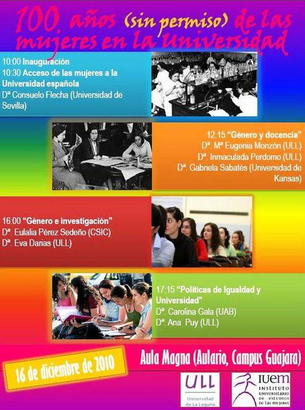 El Instituto Universitario de Estudios de las Mujeres de la Universidad de La Laguna organiza la jornada “100 años (sin permiso) de las mujeres en la universidad”, que se celebrará en el Aula Magna del Aulario de Guajara el próximo jueves, 16 de diciembre. En un siglo, las mujeres han pasado de tener vetada la entrada a las aulas, a superar en número a los hombres en el alumnado. Aún así, queda mucho camino que recorrer, ya que la igualdad no se ha producido aún en los cargos de responsabilidad académica.