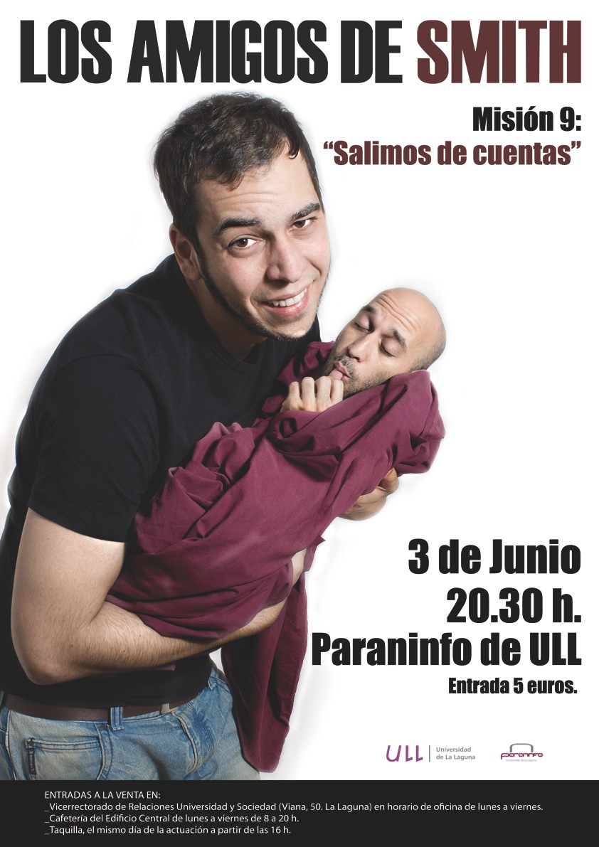 El Paraninfo de la Universidad de La Laguna acoge mañana 3 de junio a las 20.30 horas la obra de teatro "Misión 9: Salimos de cuentas”, del grupo de teatro Los amigos de Smith. Los humoristas David Tosco y Aarón Gómez, tras nueve meses de éxito con el público, estrenan en el Paraninfo un show completamente nuevo, aunque con pinceladas de los mejores momentos del dúo. Es un espectáculo con mezcla de estilos, que tiene como objetivo final hacer reír durante las dos horas de representación.
