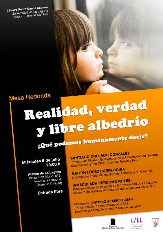La Cátedra Pedro García Cabrera de la Universidad de La Laguna, que dirige el profesor Rafael Alonso Solís, ha organizado una mesa redonda sobre “Realidad, verdad y libre albedrío. ¿Qué podemos humanamente decir?”, que se celebrará mañana miércoles 6 de julio, a las 20 horas, en el salón de actos del Ateneo de La Laguna.
