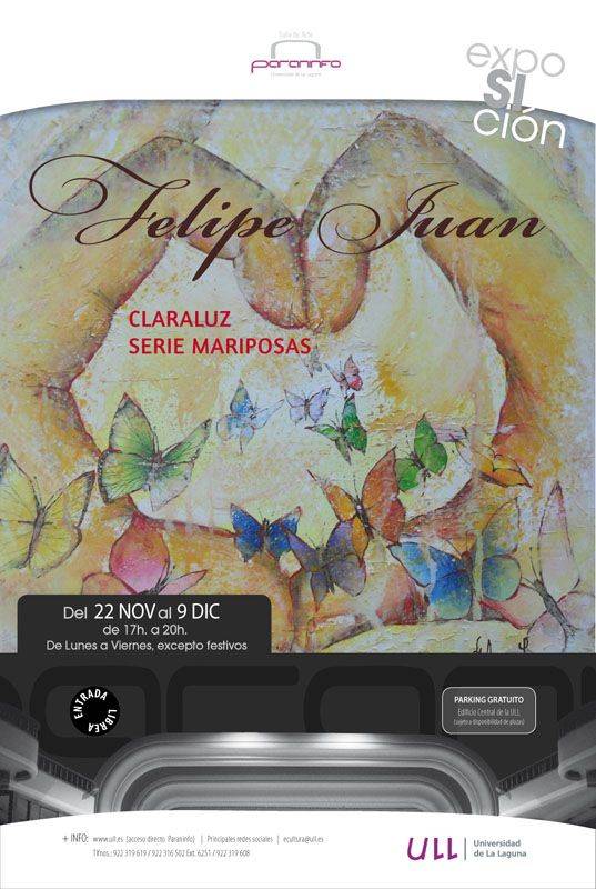 La Universidad de La Laguna inaugurará mañana miércoles 22 de noviembre en la Sala de Arte Paraninfo (Edificio Central) a las 20:30 horas, la exposición “Clara Luz. Serie de Mariposas”, del artista Felipe Juan.