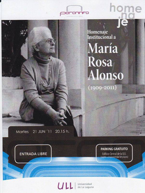 Tras el reciente fallecimiento de María Rosa Alonso, una de las plumas más importantes de las letras canarias del siglo XX, la Universidad de La Laguna ha decidido homenajear su figura con una gala que se celebrará el próximo martes, 21 de junio de 2011 a partir de las 20 horas en el Paraninfo de la institución académica. En ella se conjugará la música, la palabra y los testimonios audiovisuales, que servirán para dar fe de la gran talla artística y personal de esta intelectual.