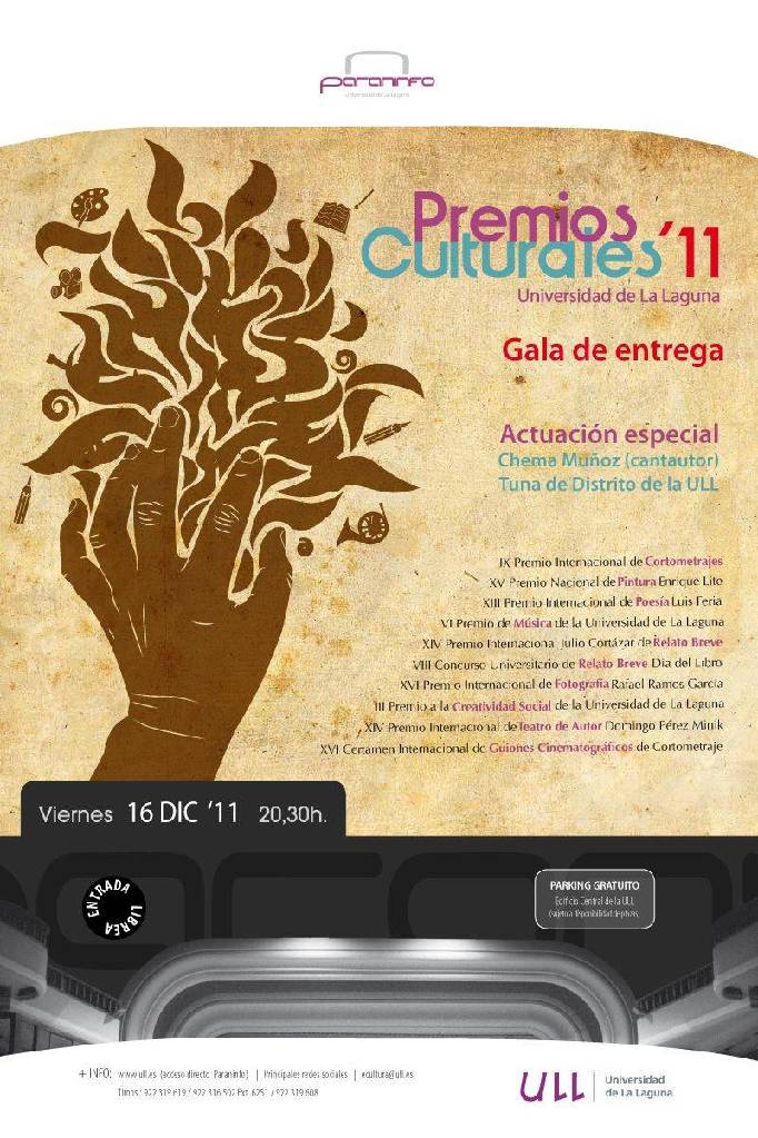 El Paraninfo de la universidad de La Laguna acogerá hoy, viernes 16 de diciembre a partir de las 20:30 horas, la gala anual en la que se harán públicos los fallos de sus diferentes certámenes culturales y se hará entrega de los galardones correspondientes a los premiados. Durante el acto, que será de entrada libre y gratuita, también actuarán el cantautor Chema Muñoz y la Tuna de Distrito universitaria.